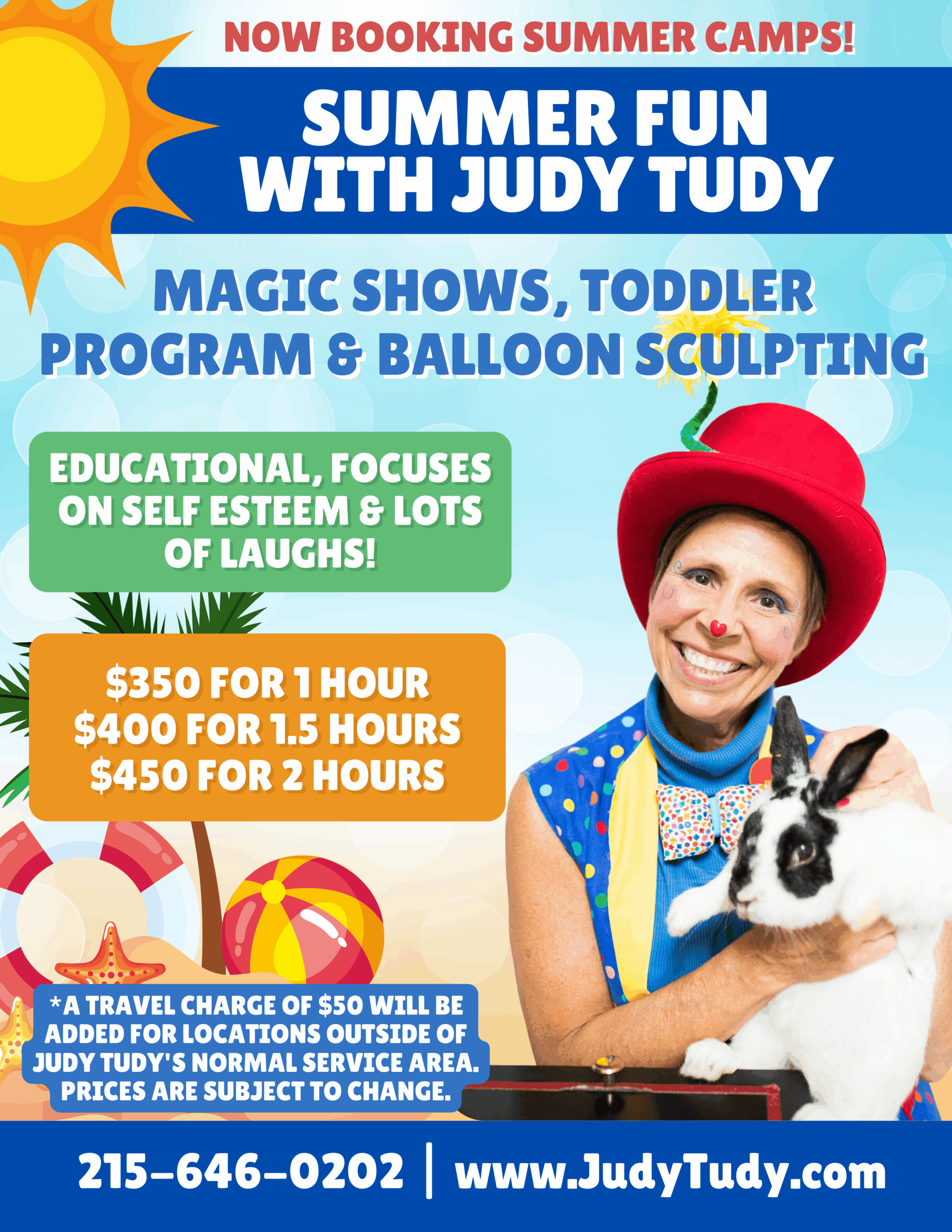 With years of experience in entertaining children and families, Judy Tudy knows how to create a fun and engaging atmosphere. Whether you’re hosting a small gathering or a large event, Judy Tudy tailors her shows to meet your specific needs. Judy’s performances encourage audience participation, ensuring that everyone is involved and having a blast. With her vibrant personality and magical talents, Judy Tudy creates unforgettable memories that your guests will cherish.